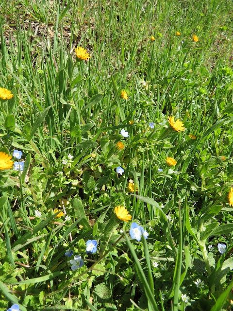 That and calendula (above...the yellow things that look like dandelions but aren't...) and some wild fumitory. I just plopped them into the planter when I got home, and this morning they seem to be doing fine.